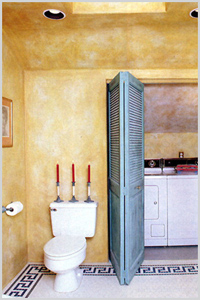 В "итальянском доме" могут сочетаться несколько фактур на одной стене одновременно: мозаичная плитка, декоративная штукатурка, настенная живопись (роспись) имитация фресок. Мозаичная плитка "терраццо" выложенная в виде изящного панно на стене (цоколь или фартук) может плавно перейти на пол.